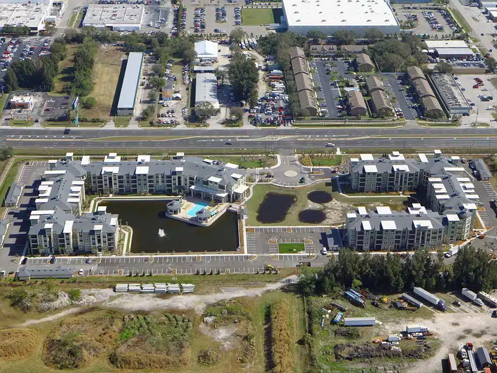 New construction of (2) four-story apartment buildings consisting of (1) Type I building with 124 units and (1) Type II building with 134 units in Largo. The complex includes a clubhouse located in building type 2, (6) 8-bay detached garages, trash compactor, maintenance building, picnic pavilion, swimming pool, cabanas, dog park, gated access, and associated site work and landscaping.