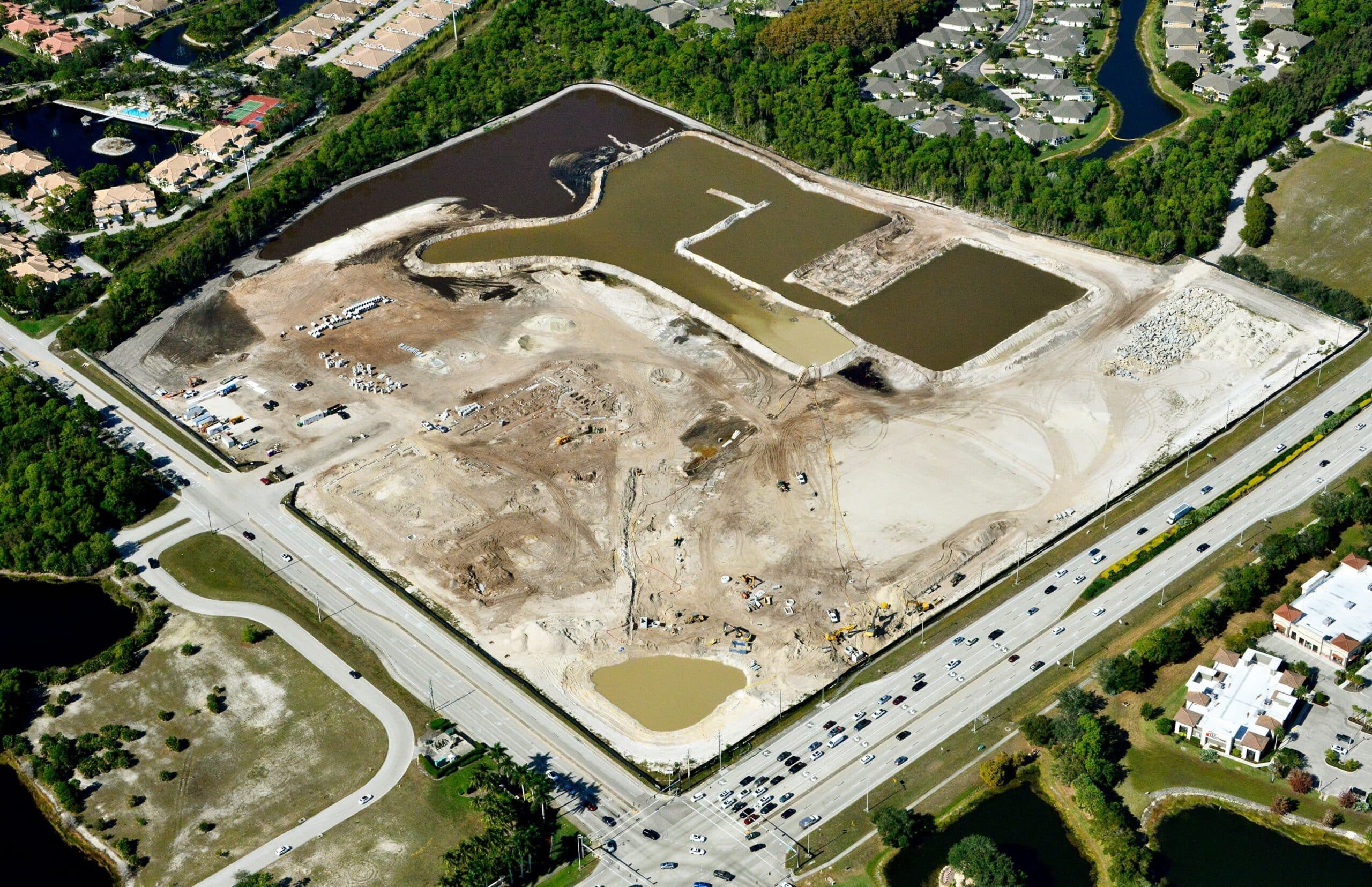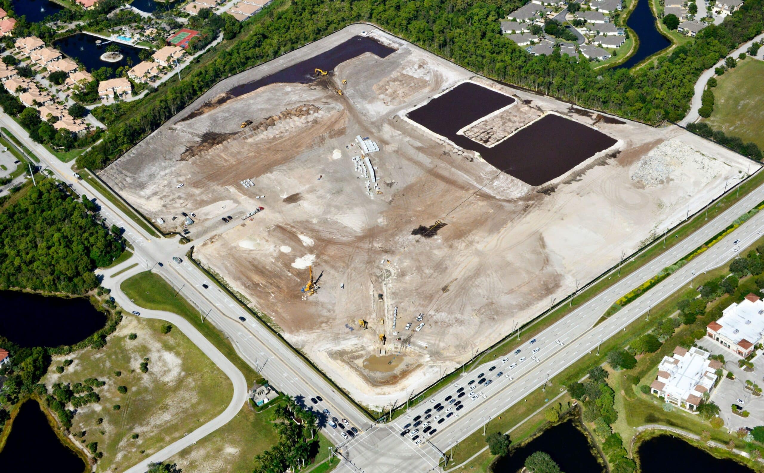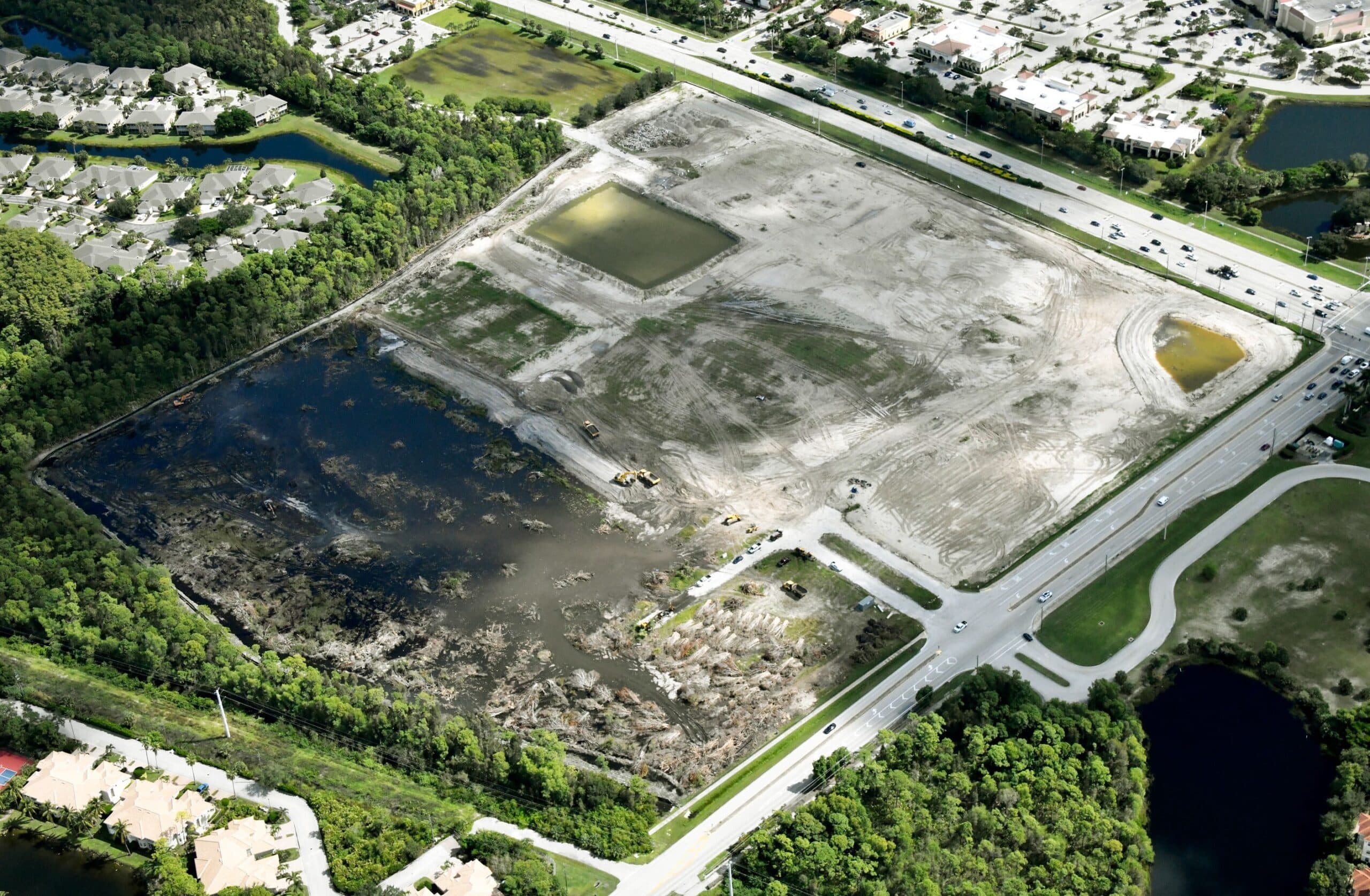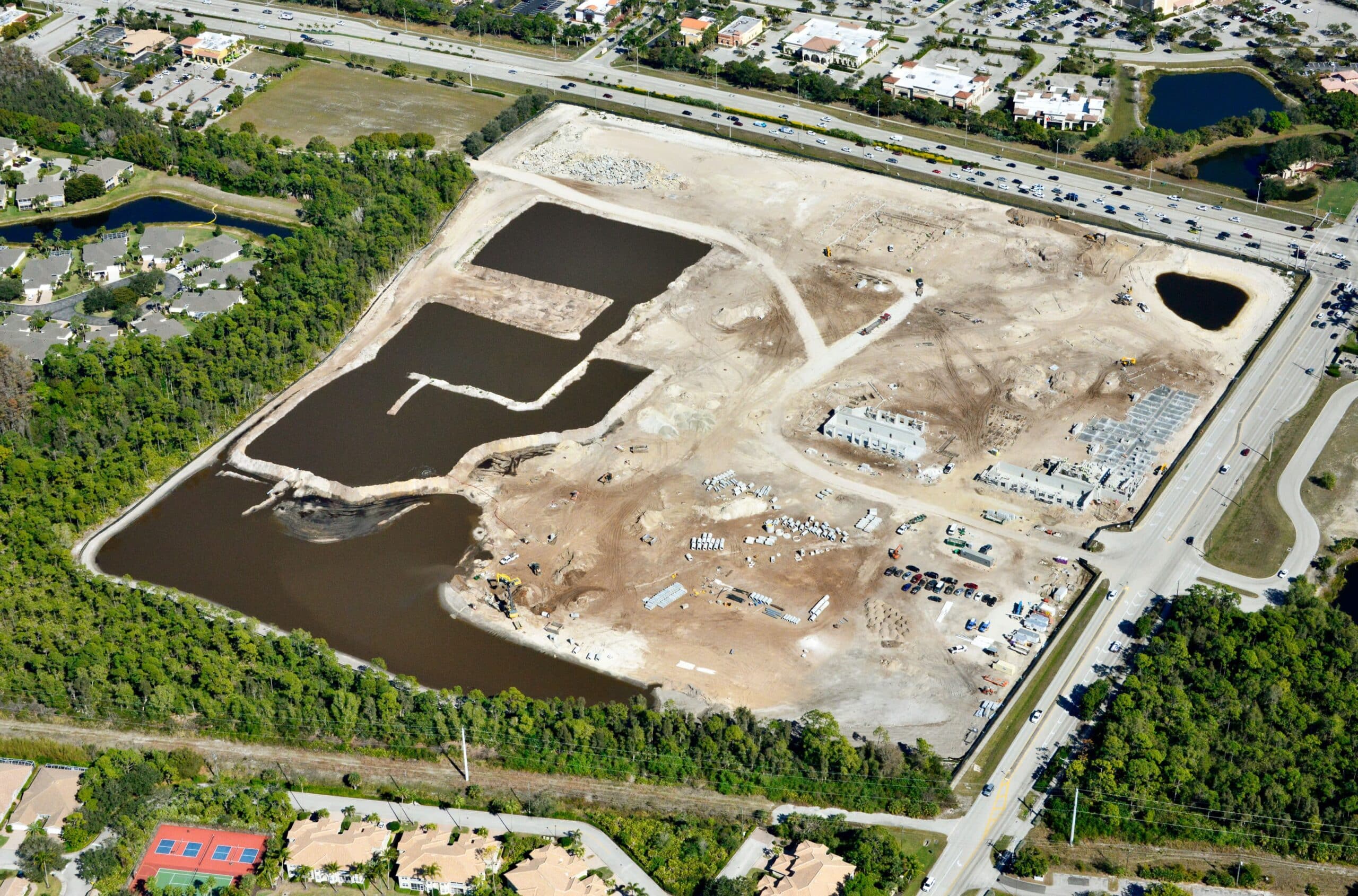 New Construction across 46.5 acres, the project includes 296 residential apartments, along with approximately 13,500 square feet of interior amenity space and approximately 25,000 square feet of commercial space, constructed in 3- and 4-story block and plank buildings with two structured parking garages, and exterior amenities including lakes, parks, landscaping, and roadways, designed to standards to achieve NGBS certification.