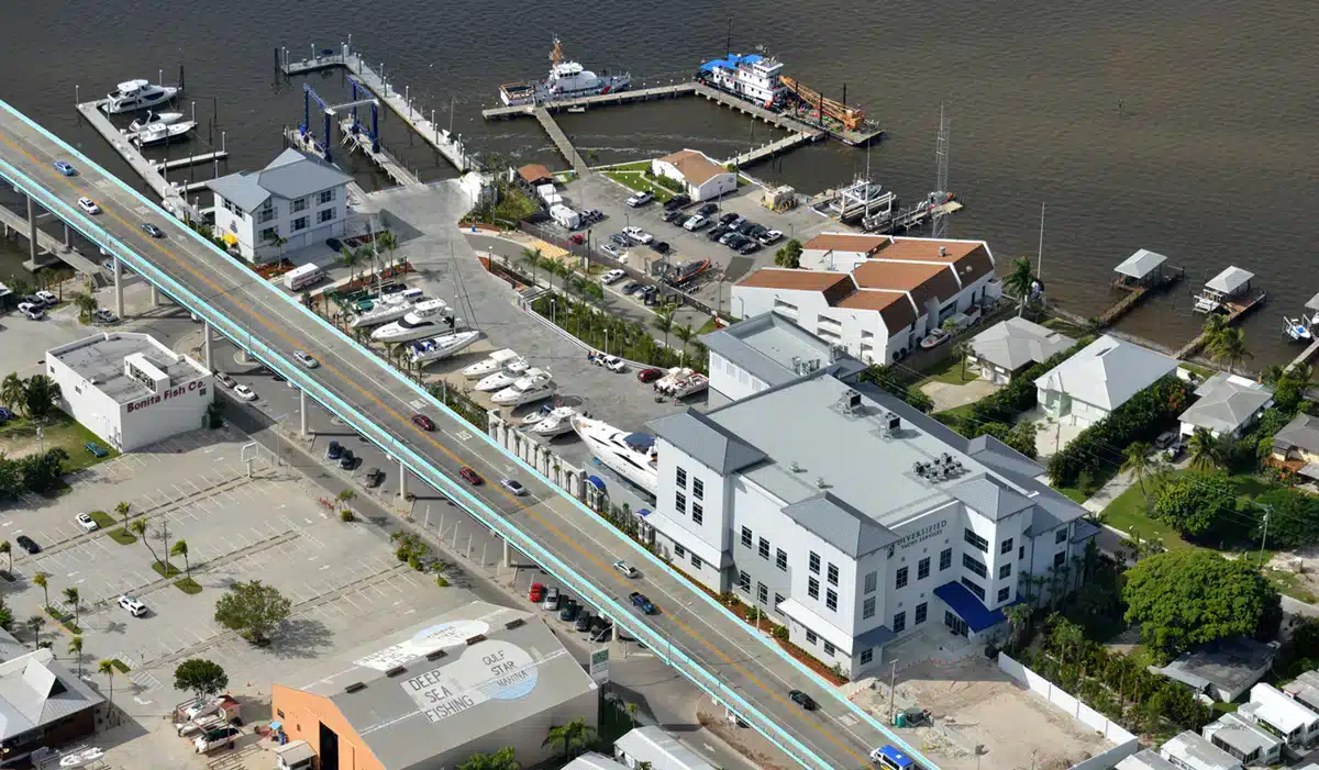 Demolition of the marina and boat storage facility that was a long-standing fixture at the mainland foot of Matanzas Bridge in Fort Myers Beach. Construction includes a new 50,000 square foot large-vessel service facility, and the 10,000 square foot harbormaster outpost. The yacht service facility houses indoor and outdoor paint booths, a 150-ton travel lift, and full waterside fueling facilities; the 80 foot tall structure can accommodate vessels of up to 110 lineal feet and is designed to withstand 150-mph winds. This facility is the first of its kind on the Florida Gulf Coast.