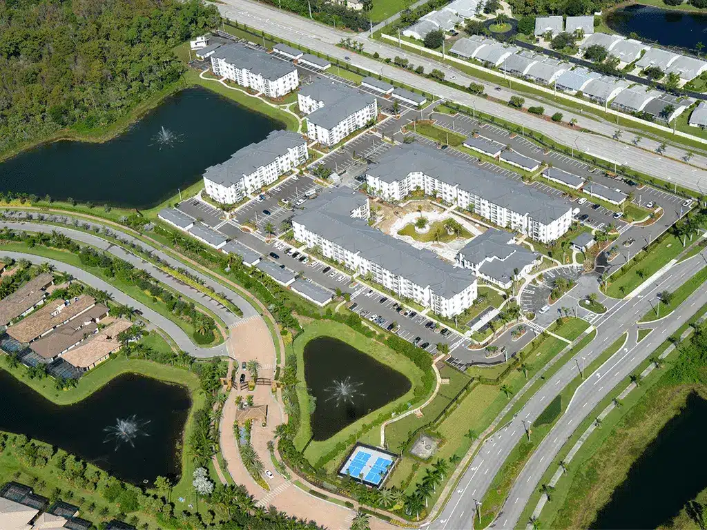 New construction of (5) four-story apartment buildings totaling 304 units in Naples. Amenities include a clubhouse, swimming pool, cabanas, outdoor fireplace, (11) 6-bay garages, (2) 6-bay ADA garages, maintenance building, sports courts, mail kiosk, trash and recycling enclosure, all other site amenities, hardscape and landscape.