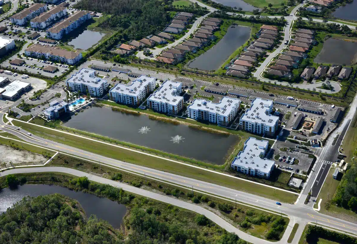 New construction of five (5) four story apartments containing 52 units each, one (1) two story apartment containing 26 units, club house with pool and amenities, nine (9) 8-bay garages, two (2) ADA Garages with one (1)  7 -bay garage and maintenance space, one (1) trash compactor with structure and associated sitework located in Naples.