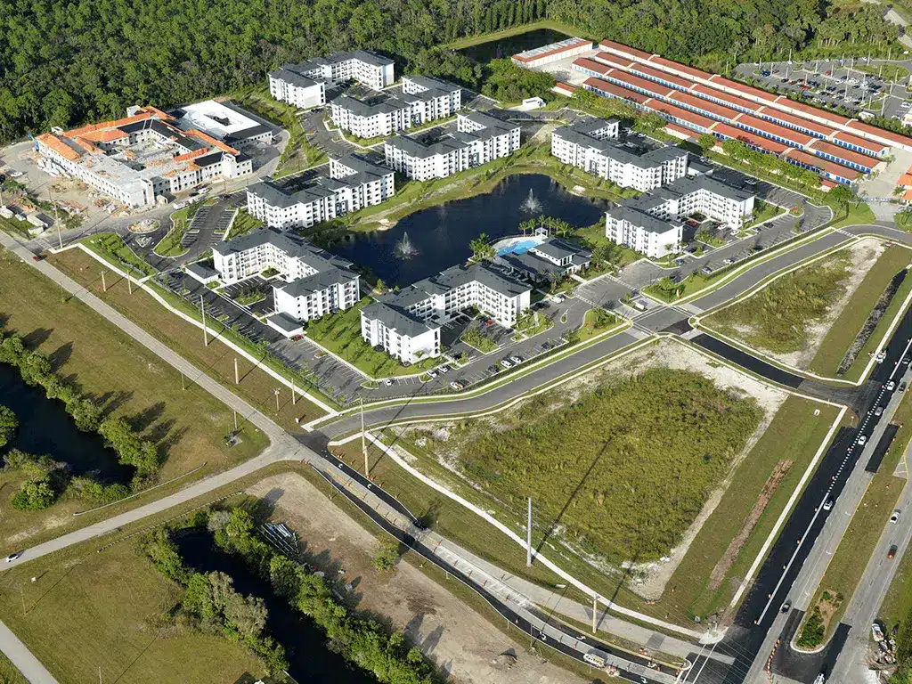 New construction of (8) 40 unit four-story apartment buildings consisting of 320 units totaling 355,520 square feet in Cape Coral. Amenities include a 8,632 square foot clubhouse, mail room, (14) 4-bay detached garages, swimming pool, trash enclosure, dog park, and all associated site work.